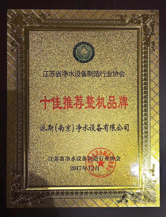 派斯榮獲江蘇省凈水協(xié)會“十佳推薦整機(jī)品牌”榮譽(yù)稱號