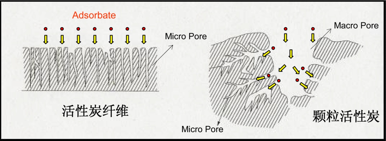 活性炭纖維是一種表面納米粒子,具有不規(guī)則的結(jié)構(gòu)與納米空間混合的體系。其纖維直徑細(xì),與被吸附物的接觸面積大,且可以均勻接觸與吸附,使吸附材料得以充分利用。效率高,且具有纖維、氈、布和紙等各種纖細(xì)的表態(tài),孔隙直接開口在纖維表面,其吸附質(zhì)到達(dá)吸附位的擴(kuò)散路徑短,且本身的外表面積較內(nèi)表面積高出兩個(gè)數(shù)量級(jí)。
