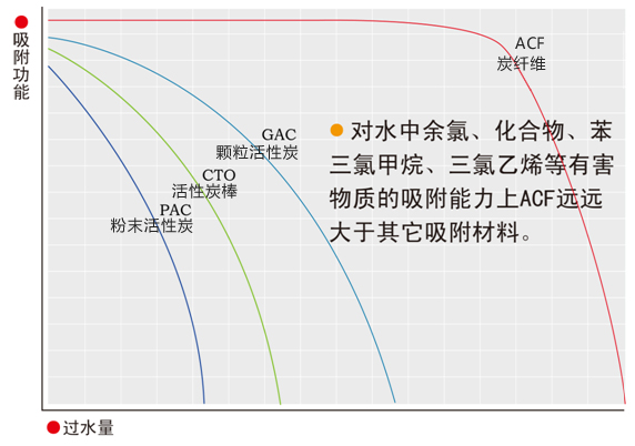 ACF(炭纖維)優(yōu)異的凈水功能來源于其微孔直接開口于纖維表面,當(dāng)水流經(jīng)ACF濾芯時(shí)水中污染物會(huì)被微孔均勻、快速地吸附;直徑纖細(xì)的纖維狀的形態(tài),使ACF凈水器對(duì)水濾阻降至極小,在保證壓力損失最小的情況下,讓水與材料充分接觸得以最大利用;實(shí)驗(yàn)表明,ACF對(duì)水中污染物的去除能力是粒狀活性炭的10~100倍,同時(shí)增加了ACF濾芯的使用壽命,減少更換成本。
