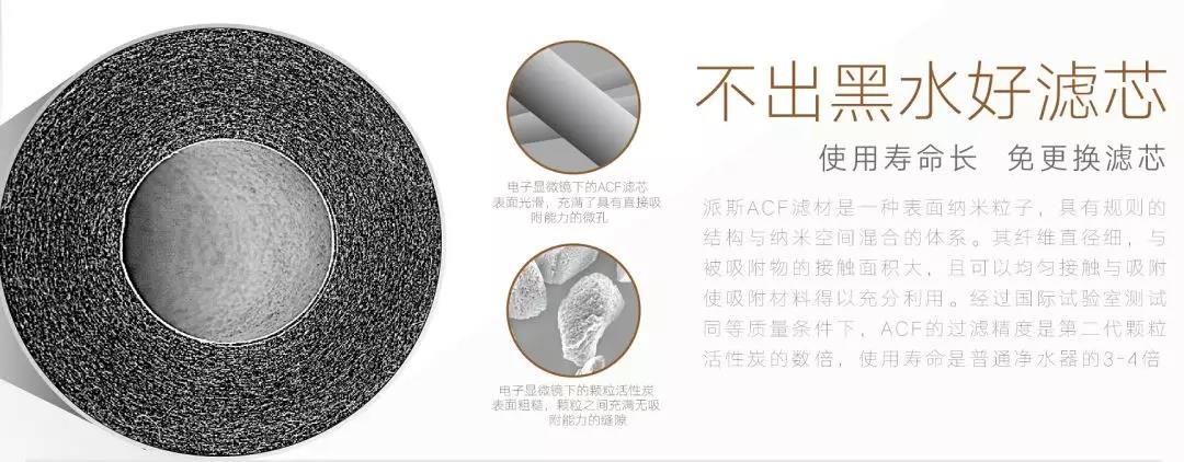 現在有人認為活性炭已經過時了,認為RO膜也能過濾消毒副產物,它才是過濾的王道。其實不然,看了上面的介紹,現在知道還有活性炭纖維這種高端貨了吧,活性炭也是在不斷發展的。而且大家要知道,RO膜過濾出來的是純水,水中任何物質不論好壞統統被過濾了,要加鹽,產生附加危害,高廢水不環保,長期飲用不利于身體健康;而派斯ACF系列凈水產品以ACF為主,進行多重過濾,可以完全過濾各種消毒副產物以及其他各種有害物質,但留下了有益的成分,不加鹽,健康環保,對比一下,高下立判!